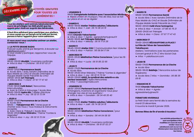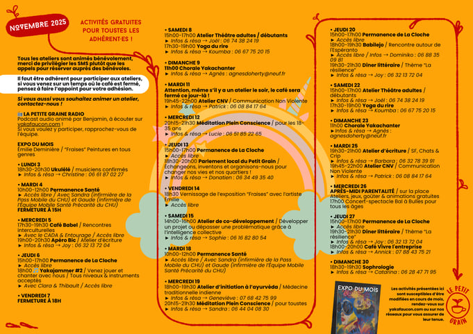Le programme ci-dessous est un visuel établi en début de mois. Il arrive que des ateliers ou événements soient modifiés en cours, le Google Agenda est quant à lui mis à jour après chaque modification.