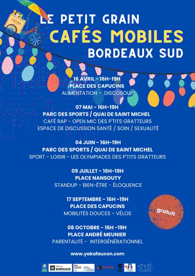 Les rdv mensuels du café mobile ont lieu sur les places du quartier Bordeaux sud : des espaces conviviaux pensés pour partager un café, s'informer, prendre soin, se divertir...ces évènements sont co-construits avec les partenaires du quartier, c'est une bonne occasion de venir les rencontrer!