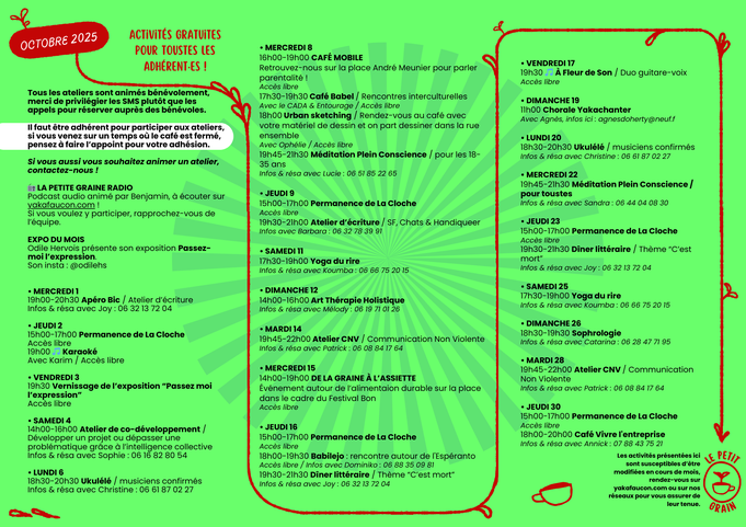 Le programme ci-dessous est un visuel établi en début de mois. Il arrive que des ateliers ou événements soient modifiés en cours, le Google Agenda est quant à lui mis à jour après chaque modification.